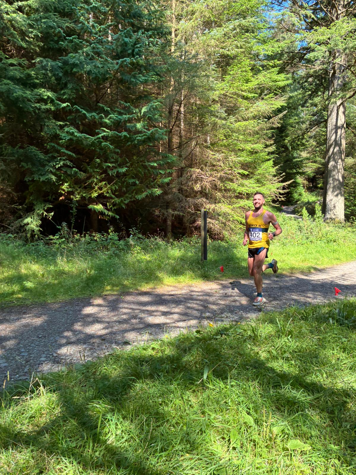 As I climbed, my whole left side started tightening up — the same familiar, unwelcome feeling I’d had a few weeks back at the Lakeland 50. I tried to push through it, but my pace was slipping. Near the Gruffalo, my clubmate Hannah Havelock-Allan sailed past, looking effortlessly strong. Just as I reached the picnic area, I heard a shout from my good friend Tommy D: “Come on, Big Sexy!” Maybe he’d caught wind of my earlier chanting echoing through the forest.